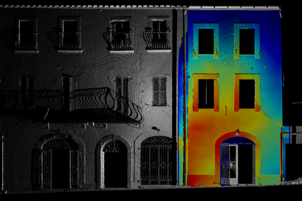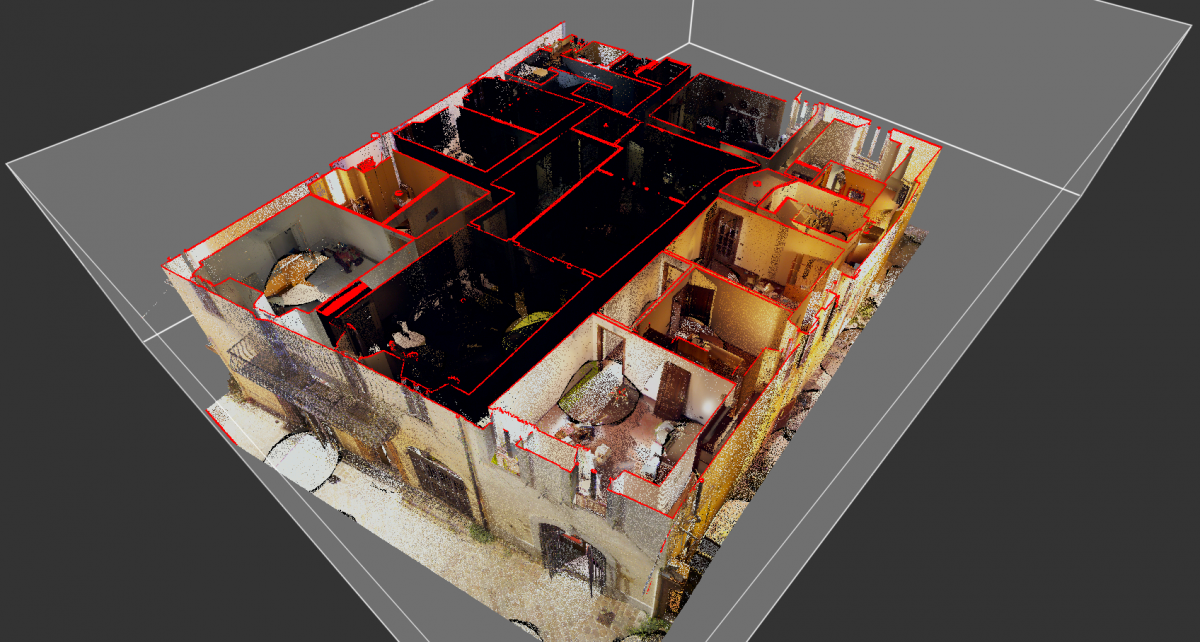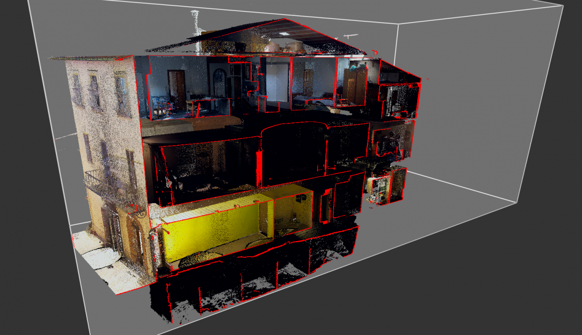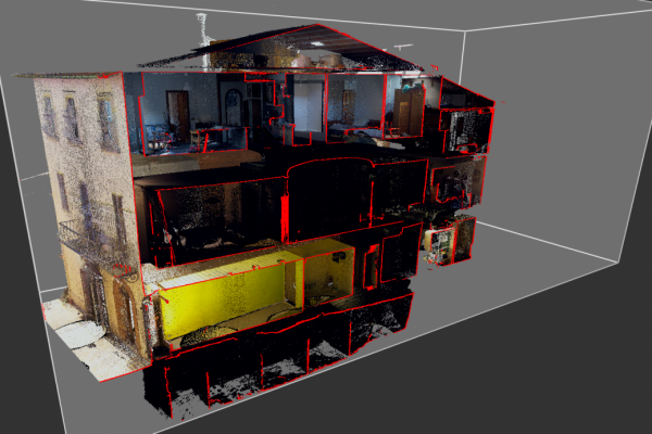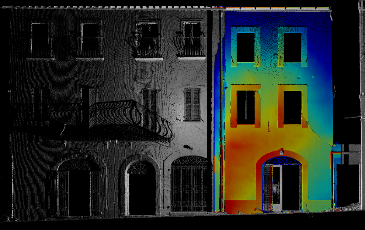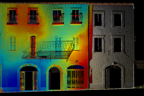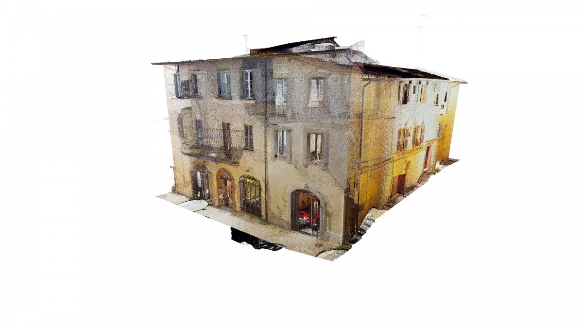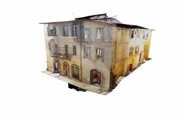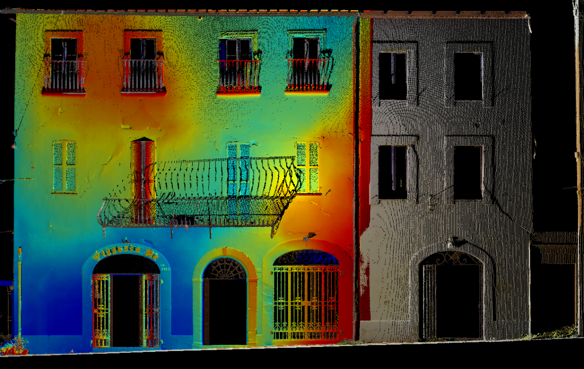 Siamo nel Centro Storico di Camerino, duramente colpito dal sisma del Centro italia del 2016. Questi edifici si sono riuniti in consorzio in modo da eseguire una ricostruzione in forma unitaria dell’aggregato. I progettisti ci hanno richiesto un rilievo Laser Scanner sufficientemente dettagliato per la rappresentazione grafica architettonica di piante, prospetti e sezioni significative oltre che alla definizione del quadro fessurativo e materico. In particolare si è effettuata anche un’analisi deformativa dei prospetti in color mapping che permette di percepire a “colpo d’occhio” lo spostamento dei singoli punti rilevati rispetto ad un piano ideale verticale. Tali informazioni sono molto importanti per la corretta definizione ed ottenimento del Livello Operativo necessario al calcolo del contributo massimo ammissibile per la ricostruzione.